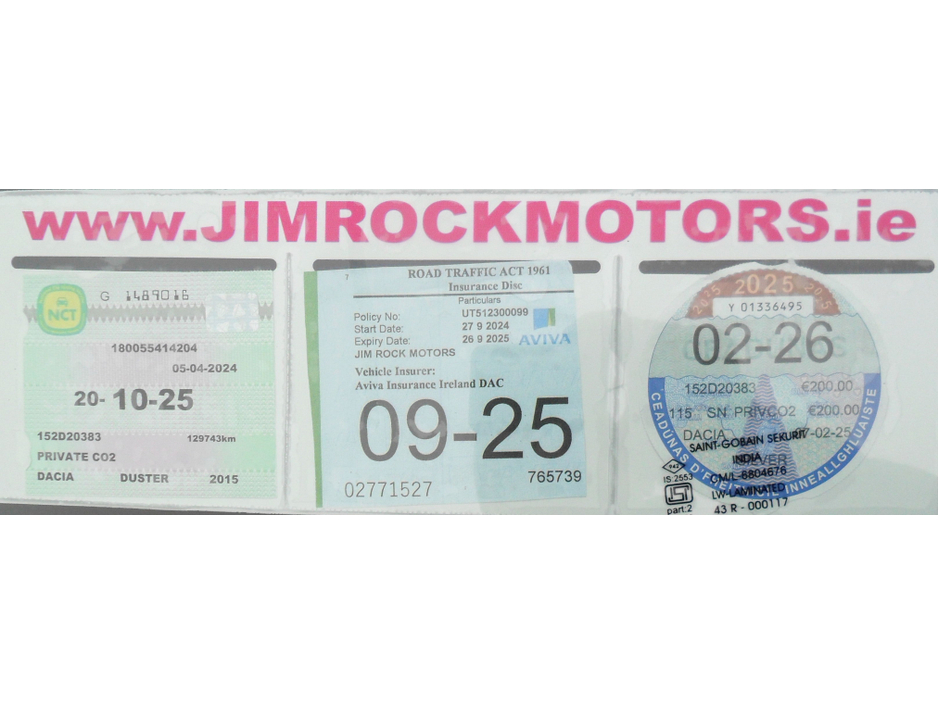 DACIA DUSTER 1.5 DCi SIGNATURE.......AIR-CON.......CRUISE CONTROL.........NCT 10/26.......TAXED 03/26........€200 PER YEAR ROAD TAX.......REMOTE CENTRAL LOCKING.......ELECTRIC WINDOWS AND MIRRORS... ... ...ALLOY WHEELS......FOG LIGHTS.......CD/RADIO........6-SPEED GEARBOX........ROOF RAILS.......WWW.JIMROCKMOTORS.IE Air Conditioning, Central Locking, Immaculate condition, Perfect working order, Price Or Near Offer, Electric Windows, Airbag, Alloy Wheels, Cruise Control, Electric Mirrors, Fog Lamps, Immobiliser, Luggage Cover, Multi-function steering wheel, Roof Rails, Traction Control, Metallic Paint, Multiple Air Bags, Side Impact Protection, Anti-Theft System, 3 Month Warranty, Trade in accepted, Bluetooth, New Timing Belt, Remote Central Locking, EBD, Folding rear seats, Six speed transmission, Isofix, History Checked, Finance Checked, Active Safety Braking / City Brake / Collision Alert, External Devices Connectivity, Cup holders, Stability control