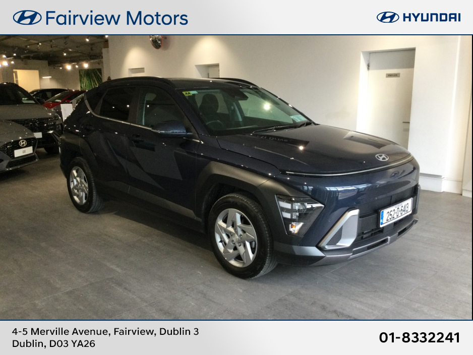 252 Demo Model Hyundai Kona Elegance Finished In Denim Blue Now Available Here In Fairview Motors. Unlimited Mileage Warranty With Free AA Membership Until July 2030. Great Performance And Economy Fro ... m 1.0 Petrol Engine Along With Low Road Tax. Call Our Sales Team Now On 01 8332241 To Book Your Test Drive. Finance Arranged. Air Conditioning, Central Locking, Electric Windows, Airbag, Alarm, Alloy Wheels, Cruise Control, Electric Mirrors, Immobiliser, Rear Spoiler, Privacy Glass, Automatic Wipers, Automatic Lights, Centre Armrest, Luggage Cover, Multi-function steering wheel, Roof Rails, Satellite Navigation, Traction Control, Metallic Paint, Anti-Theft System, Parking Sensors, Bluetooth, Remote Central Locking, EBD, Electronic handbrake, Folding rear seats, Six speed transmission, Isofix, Roadside assistance, Apple Car Play, Android Auto, Mirror Link, Keyless Entry, Heated Front Seats, Reversing Camera, Front Parking Sensors, Lane Departure Warning, Space Saver Spare Wheel, Electro Chrome Rear View Mirror, Speed Sign Recognition & Recommendation, Active Safety Braking / City Brake / Collision Alert, Heated Steering Wheel, Adaptive Cruise Control, Stop/Start Button, Touch Screen Media Control, Driver Fatigue Warning, Drive Mode Selector, Dual Zone Climate Control, Daytime Running Lights, Manufacturer Warranty, 2 Keys, External Devices Connectivity, Cup holders, Stability control