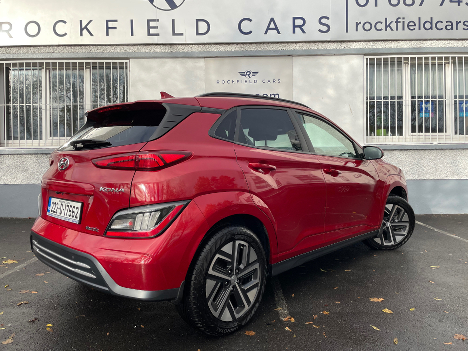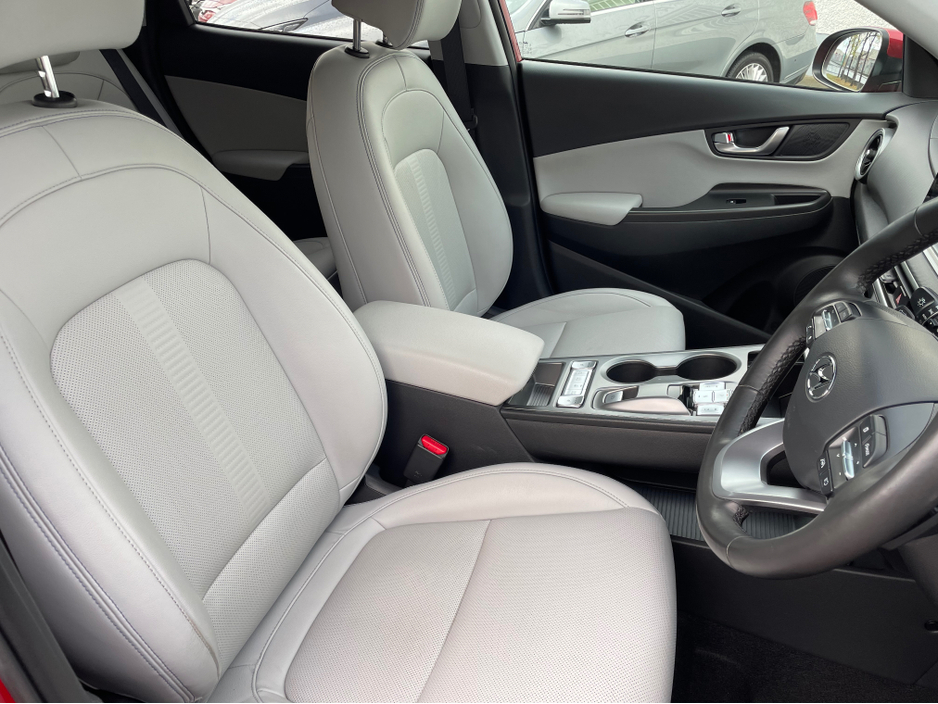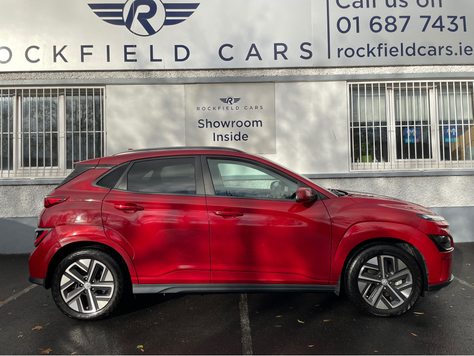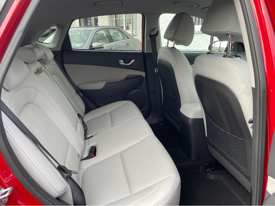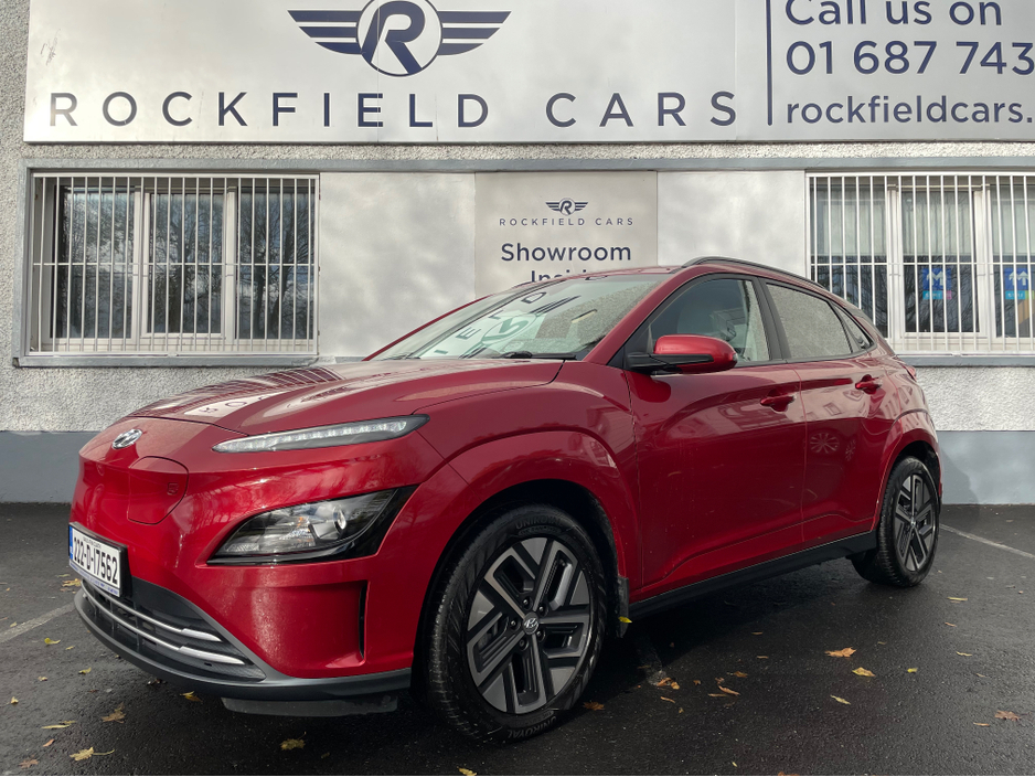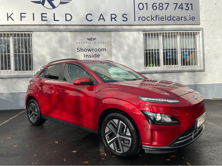 SOH 97.6% SEE PICTURE NO. 2 -ELECTRIC KONA - HYUNDAI KONA - FULLY ELECTRIC AUTOMATIC - 64KW BIGGER BATTERY - FULL SERVICE HISTORY - JUST SERVICED - DARK RED EXTERIOR WITH CONTRASTING LIGHT GREY LEATHE ... R INTERIOR - ELECTRIC FOLDING MIRRORS - PARK ASSIST WITH REVERSING CAMERA - APPLE/ANDROID PLAY - SAT NAV - LEATHER MULTI FUNCTIONAL STEERING - USB PORT - BLUETOOTH PHONE - DUAL CLIMATE CONTROL - AIR CONDITIONING - CD PLAYER - ALL ELECTRIC WINDOWS AND MIRRORS - LOTS MORE EXTRAS - ISOFIX - REMOTE CENTRAL LOCKING - MULTIPLE AIR BAGS - WARRANTY PROVIDED - FINANCE ARRANGED WWW. ROCKFIELDCARS. IE - IF YOU REQUIRE ANY FURTHER INFORMATION RELATING TO THIS VEHICLE OR TO ARRANGE A TEST DRIVE PHONE RICHARD ON 087-2888503 OR ON 01-6877431 OR EMAIL SALES@ROCKFIELDCARS.IE Central Locking, Electric Windows, Airbag, Fog Lamps, Rear Spoiler, Privacy Glass, Centre Armrest, Multi-function steering wheel, Roof Rails, Satellite Navigation, Traction Control, Parking Sensors, Bluetooth, EBD, Isofix, Active Safety Braking / City Brake / Collision Alert, External Devices Connectivity, Cup holders, Remote boot/hatch/rear door release, Stability control