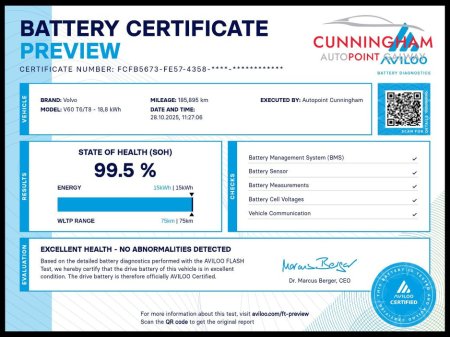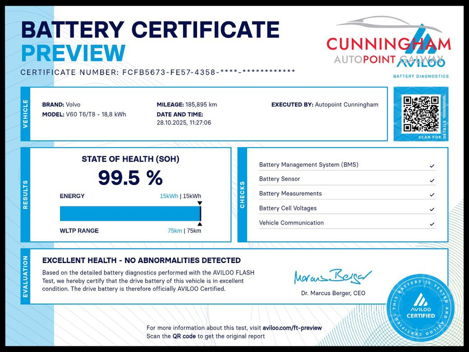 Coming with a 99.5% Battery Health Score from Aviloo, the worlds #1 EV battery testing company. See certificate in vehicle images, scan QR code in image for extra information.